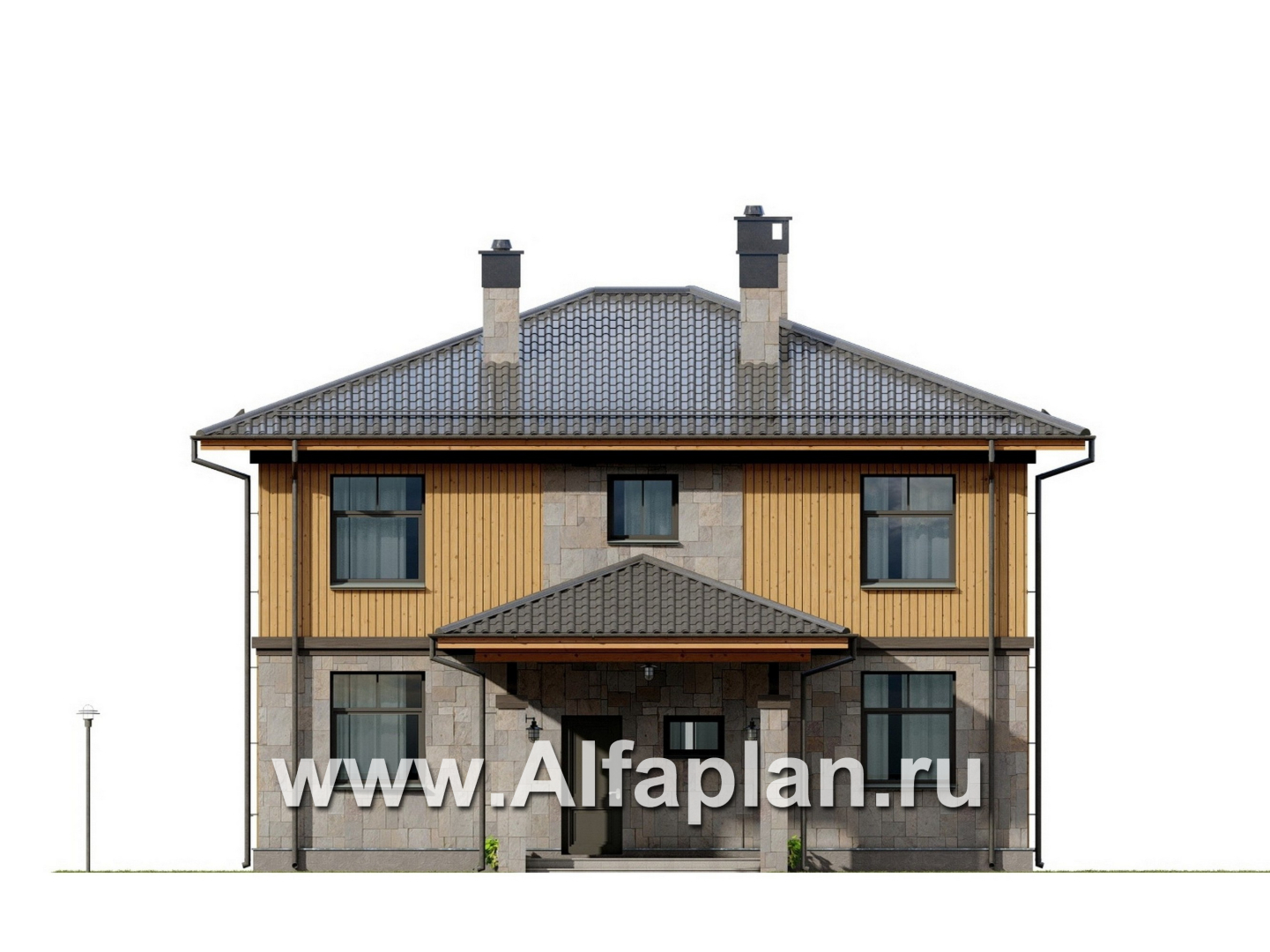 Экстерьер данного проекта коттеджа очень прост и красив. Четырехскатная крыша, широкое крыльцо с колоннами, большие окна, гарантирующие отличную освещенность. Фасад элегантной цветовой гамме – белого и «кофе с молоком».