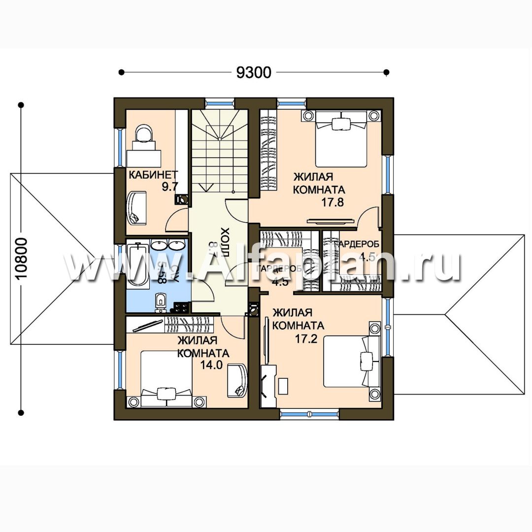 Второй уровень, по современным стандартам – зона отдыха для хозяев. Здесь спроектированы 3 спальни и просторный кабинет. Все эти комнаты угловые и очень светлые. Две больших спальни имеют собственные гардеробные. Санузел здесь больше, чем на первом уровне, и имеет вход из длинного холла, расположенного в центре этажа.