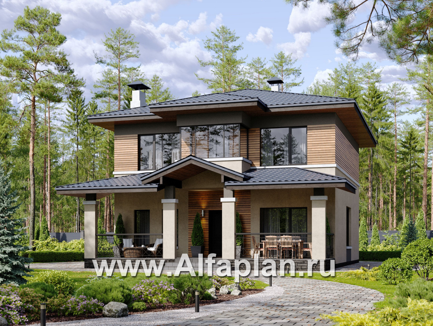 «Невада» - проект двухэтажного дома из газобетона, с террасой со стороны входа, в стиле Райта