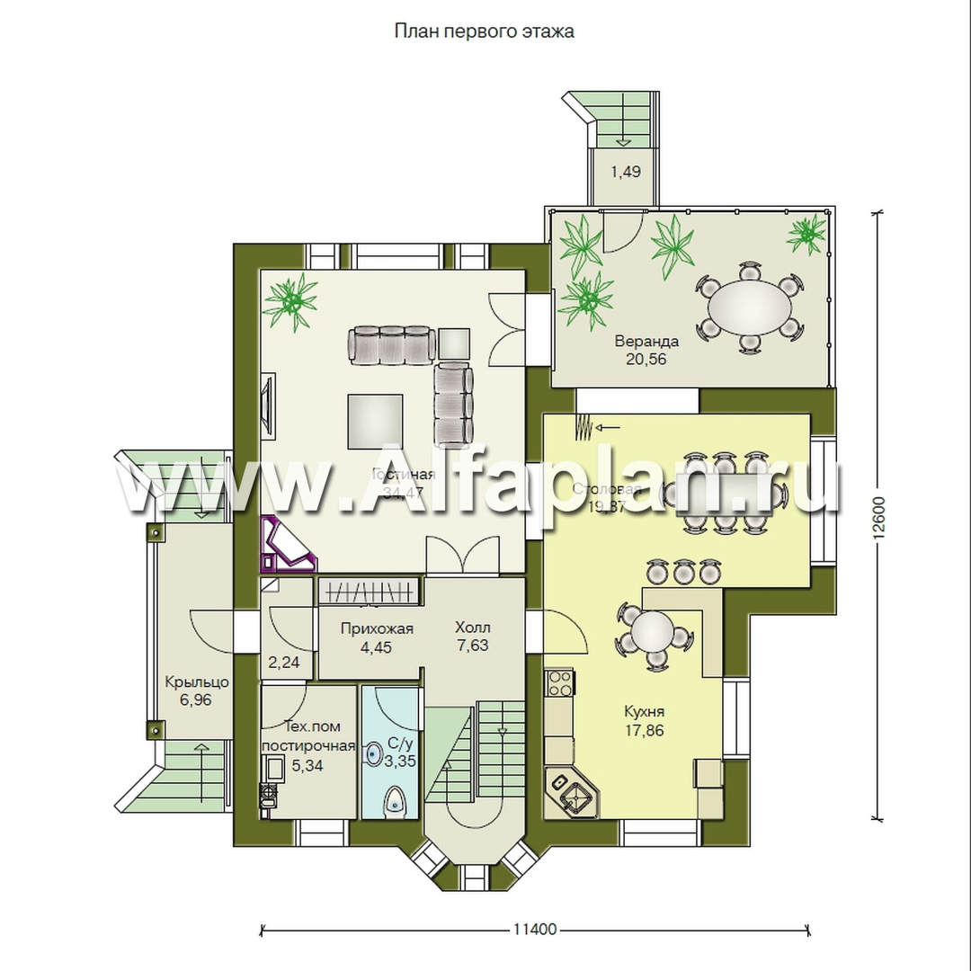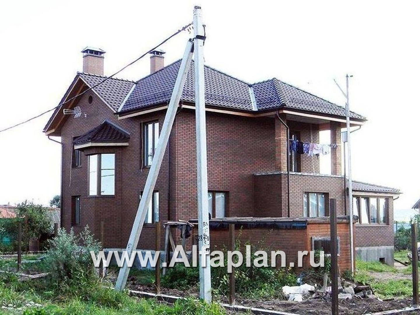 Этот проект удачен не только с точки зрения красоты и функциональности. Его сильная сторона – в надежном монолитном фундаменте, прочных кирпичных или газобетонных (на выбор) наружных стенах и в долговечной битумной черепице. Наружные стены декорируются лицевым кирпичом или деревянной вагонкой в зависимости от пожеланий заказчика. Цокольная часть фасада отделана искусственным камнем.