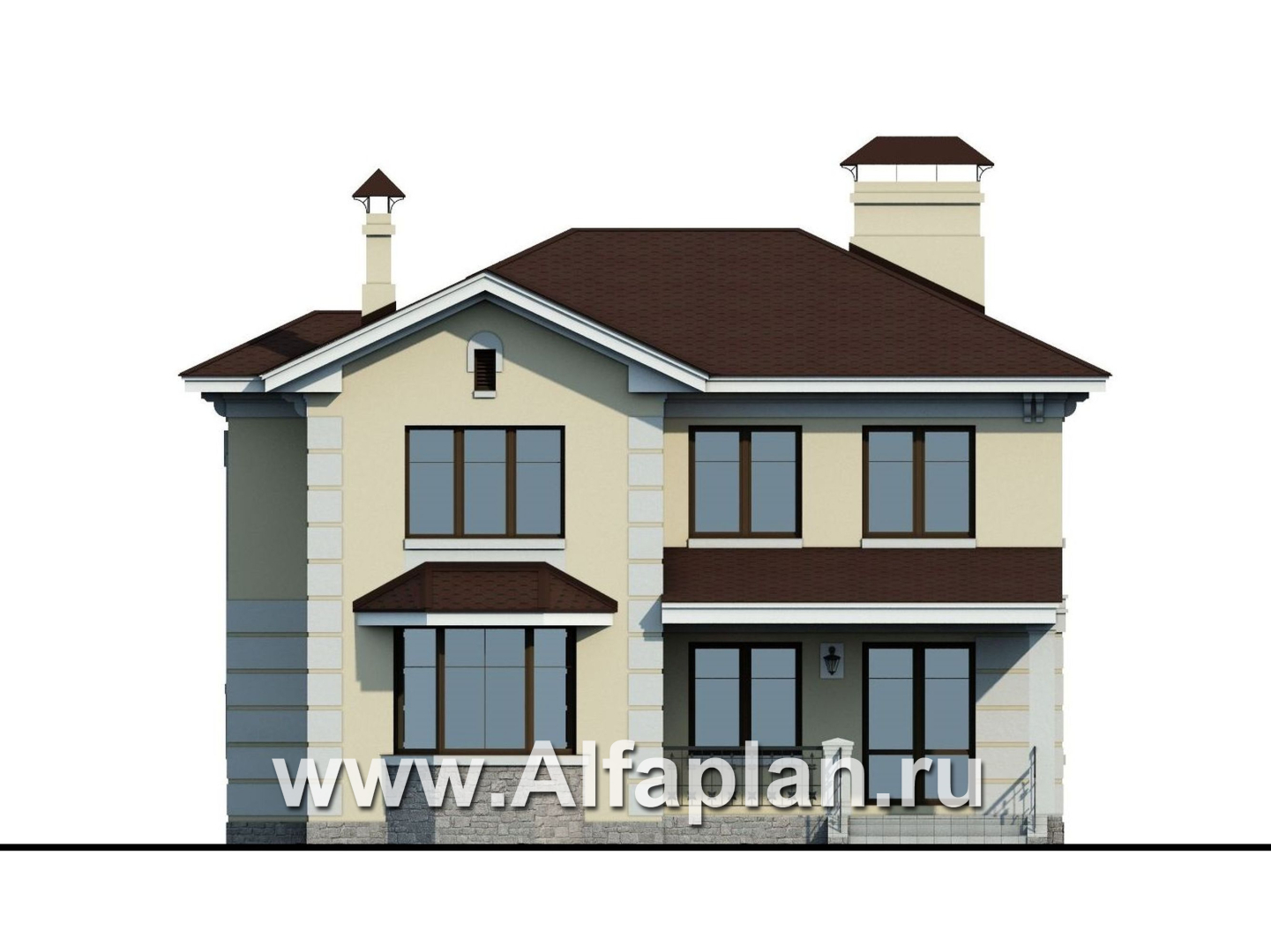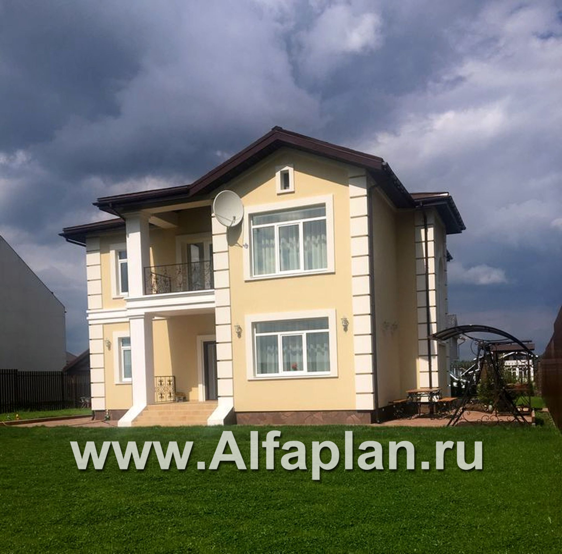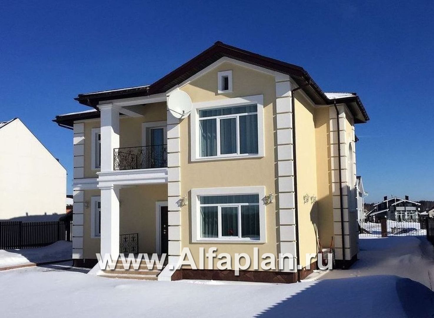 При общей площади в 203 м² и жилой — 105 м², проект имеет два полноценных по высоте этажа, завершенные вальмовой кровлей. Глубокий шоколадный тон битумной черепицы, окантованной белоснежными полосами, удачно оттеняет светлые оштукатуренные стены. Они могут быть как из газобетона, так и из кирпича. Обилие окон дает помещениям достаточную освещенность.