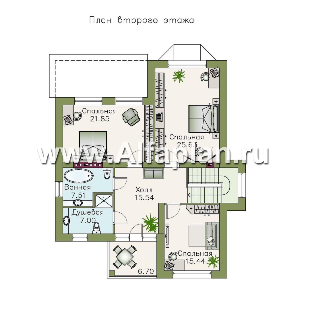 Второй этаж — «ночная» зона состоит из трех спален. Все они выходят в довольно просторный холл, сообщенный с лестницей. Также из холла можно попасть в помещения душевой, ванной с джакузи и выйти на небольшой симпатичный балкончик.