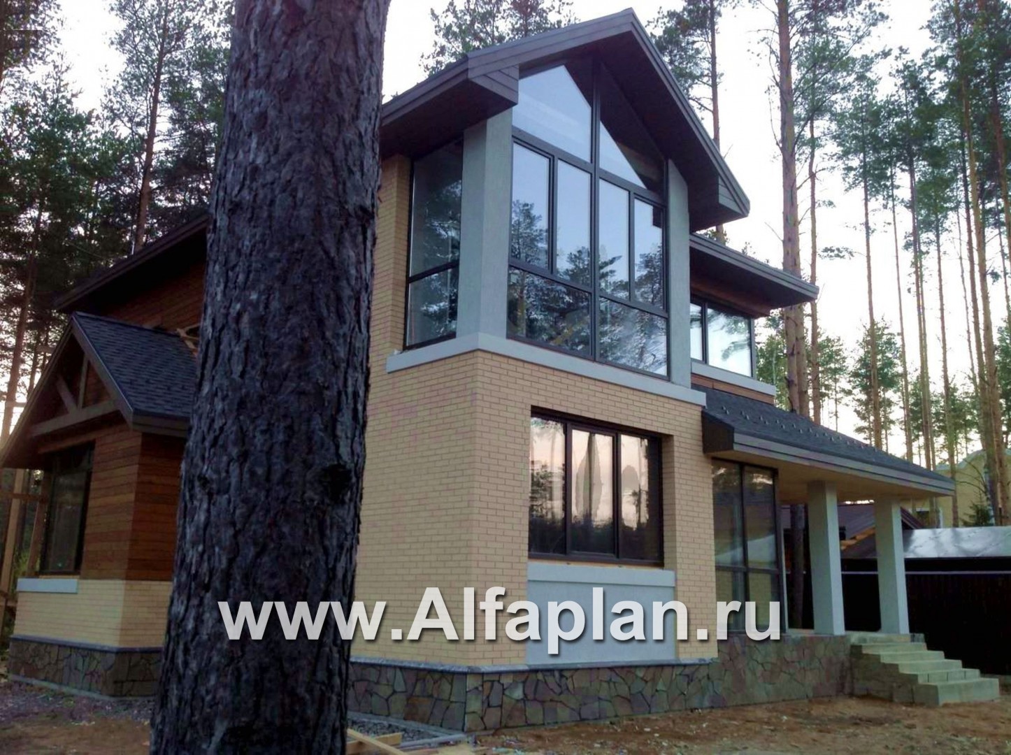 Перед вами компактный двухэтажный коттедж. Этот дом особенно будет привлекательным для любителей просторных, хорошо освещенных интерьеров, так как в доме много окон и есть угловые витражи. Такой дом бессмысленно пытаться впихнуть в плотную застройку или пытаться прятать его за высокий забор. Данный проект требует простора и живописного окружения. При этом коттедж 106В имеет компактный план, не требующий большого участка. В основании дома заложена монолитная ж/б плита. В отношении материалов, используемых в строительстве наружных стен, коттедж 106В предусматривает альтернативное решение – можно использовать как кирпич, так и газобетонные блоки. В этом отношении коттедж под номером 106В можно отнести к категории «проекты кирпичных и газобетонных домов».