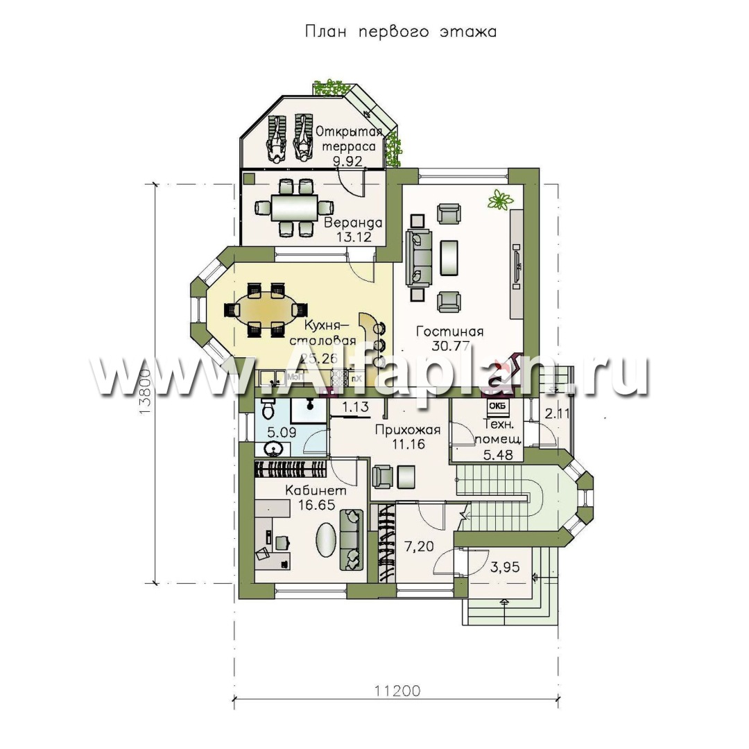 169A-S «Бестужев» - проект двухэтажного коттеджа, с эркером и с террасой, план дома с кабинетом на 1 эт