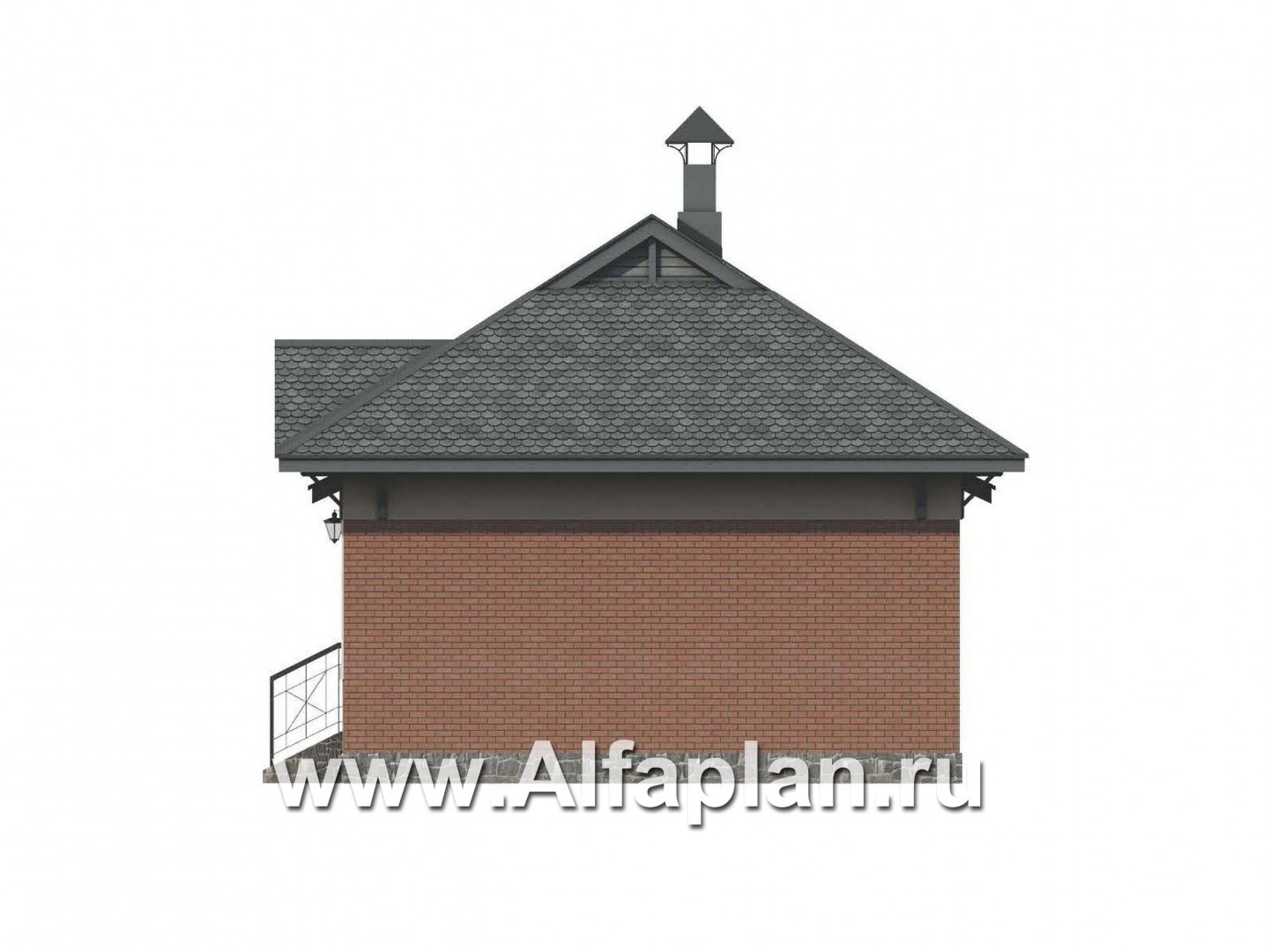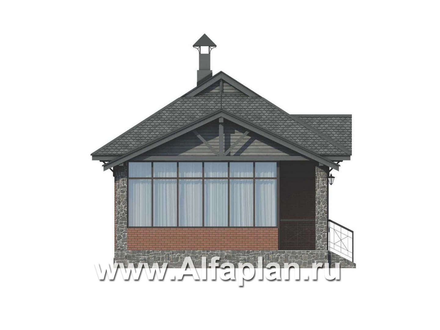 Одноэтажный дом с экстерьером в коричнево-бежевых цветах и контрастным оформлением окон можно использовать как гостевой или дачный. Застекленная веранда представляет собой полноценную летнюю столовую. В небольшом пространстве есть все необходимое для приятного отдыха за городом.