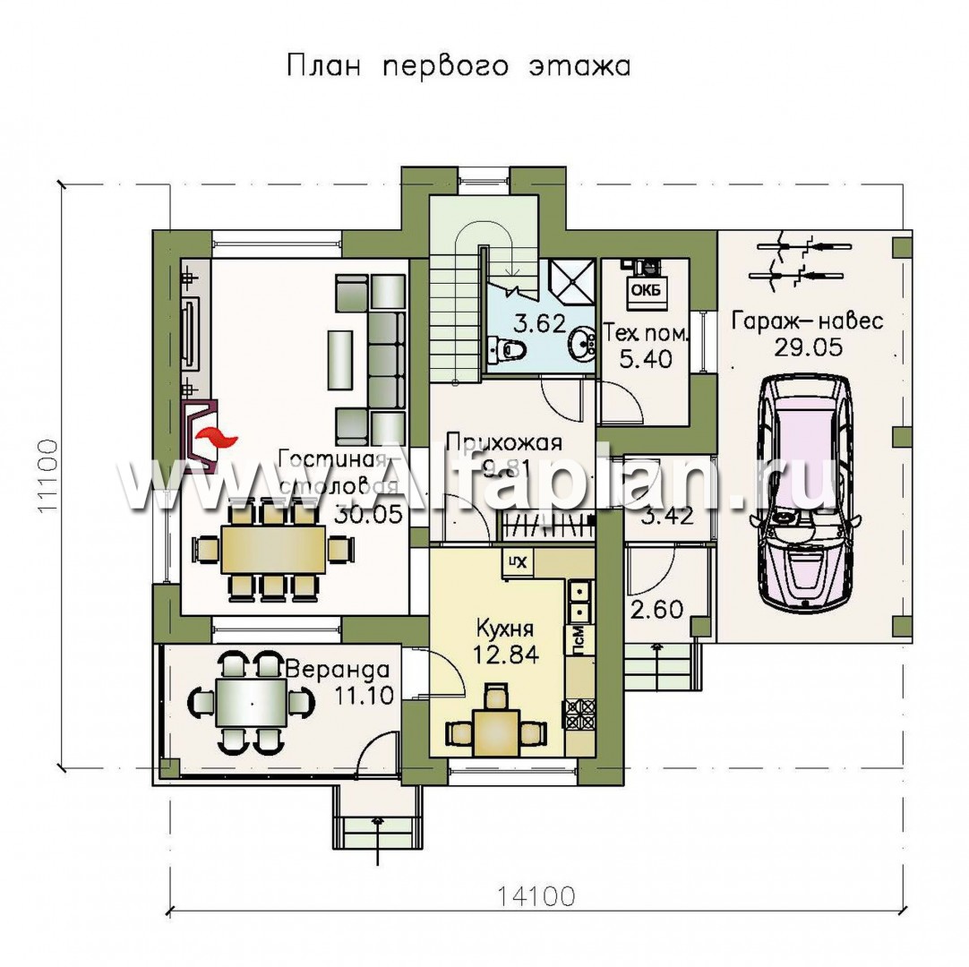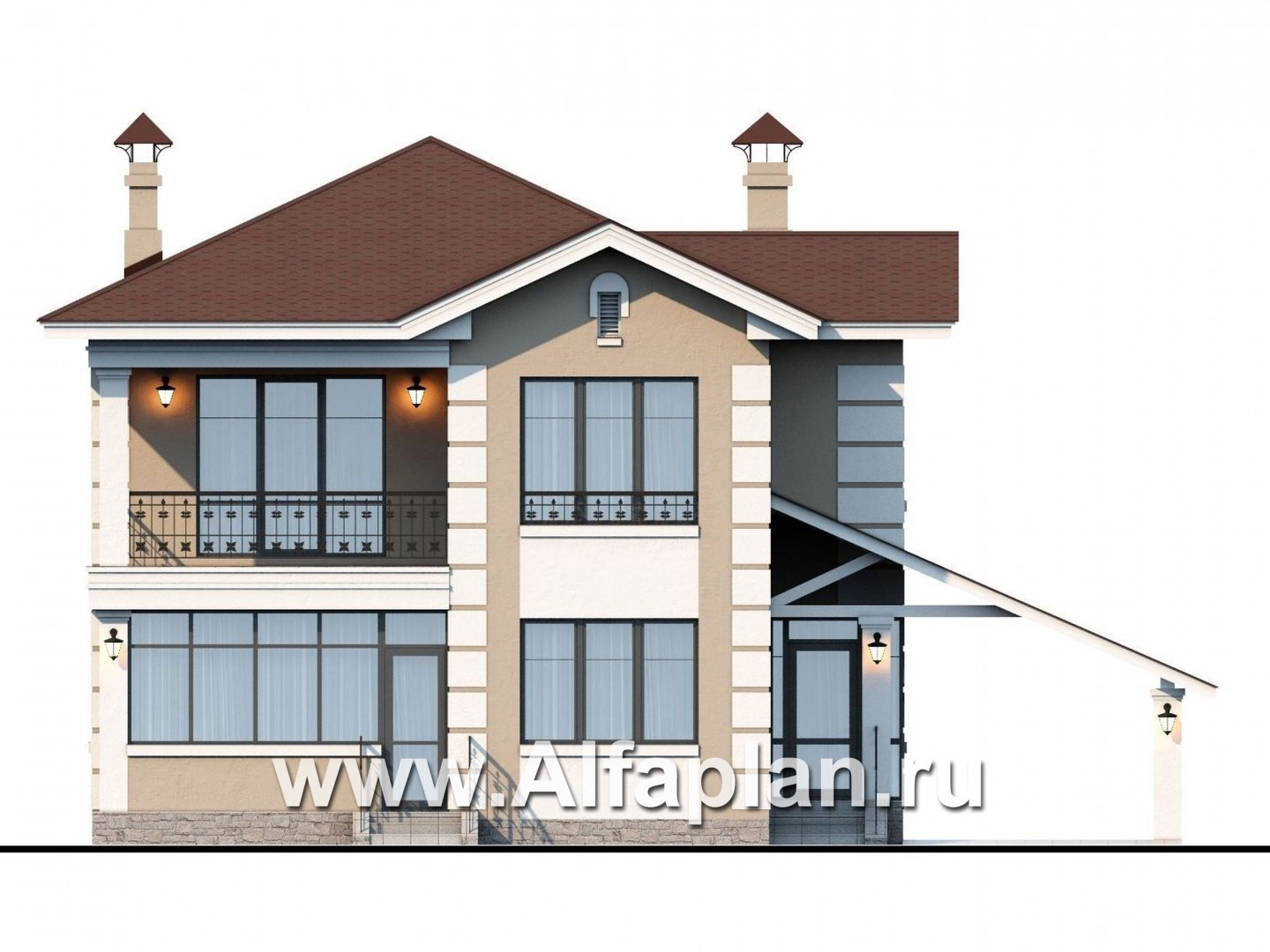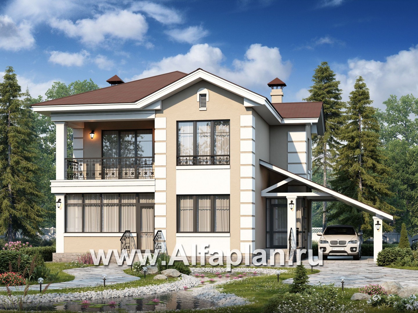 «Знаменка» - проект двухэтажного дома из газобетона, планировка с эркером и с террасой, с навесом на 1 авто