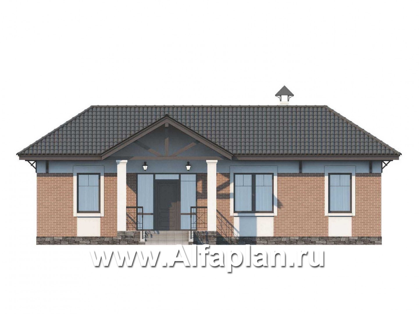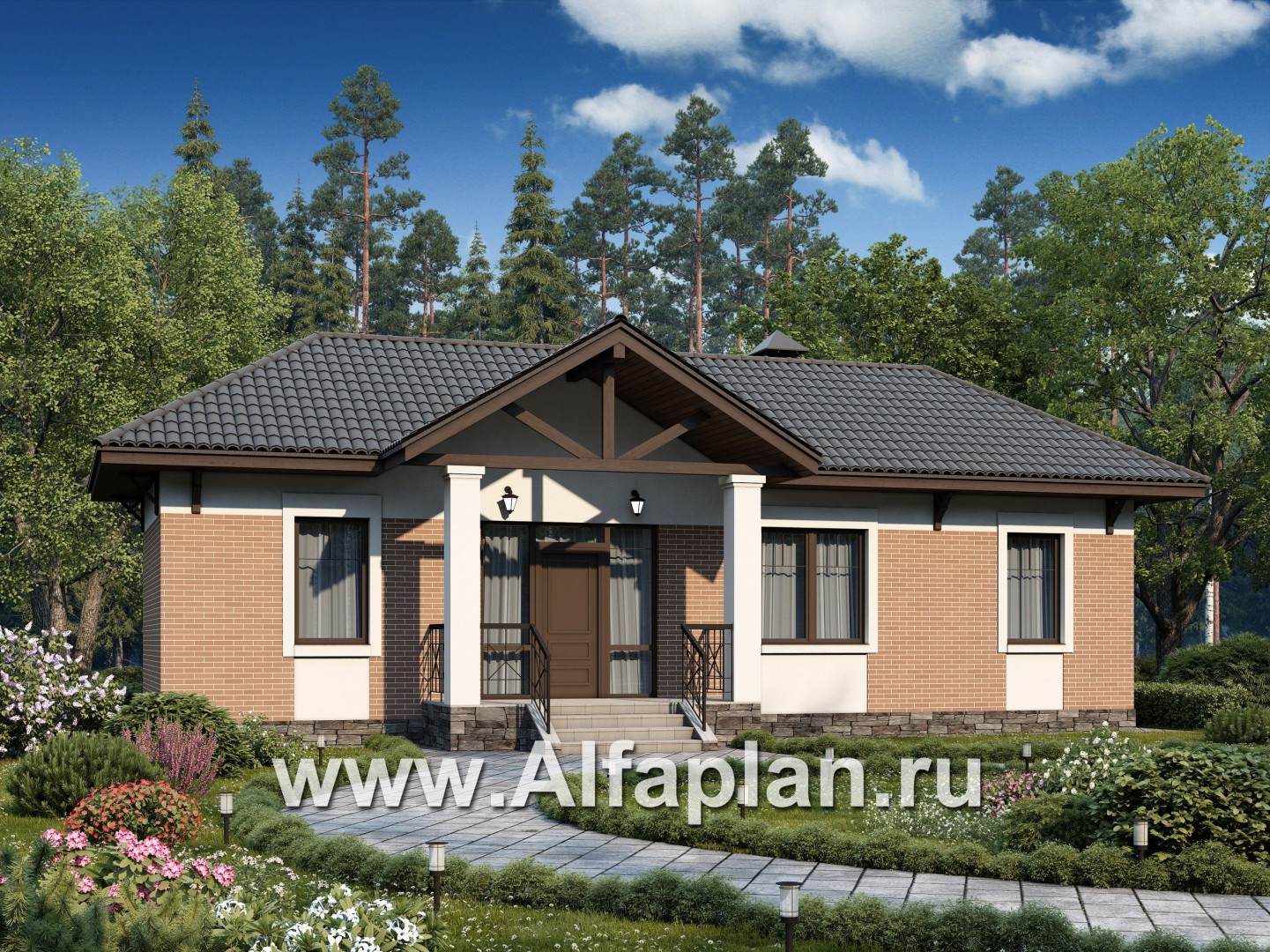 Представленный здесь проект пено-, газобетонного дома имеет всего один этаж. Смысловым центром является прихожая, расположенная на одной линии с центральным входом. Часть пространства этого помещения отдана под гардеробную.