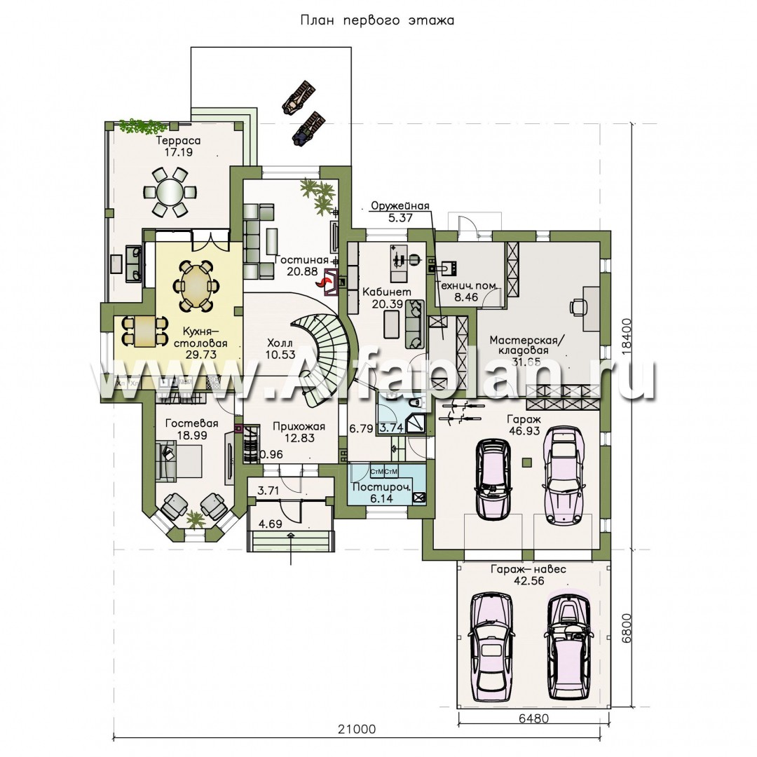 114K-S «Воронцов» - проект двухэтажного дома из газобетона с эркером, с биллиардной, с гаражом и навесом на 4 авто