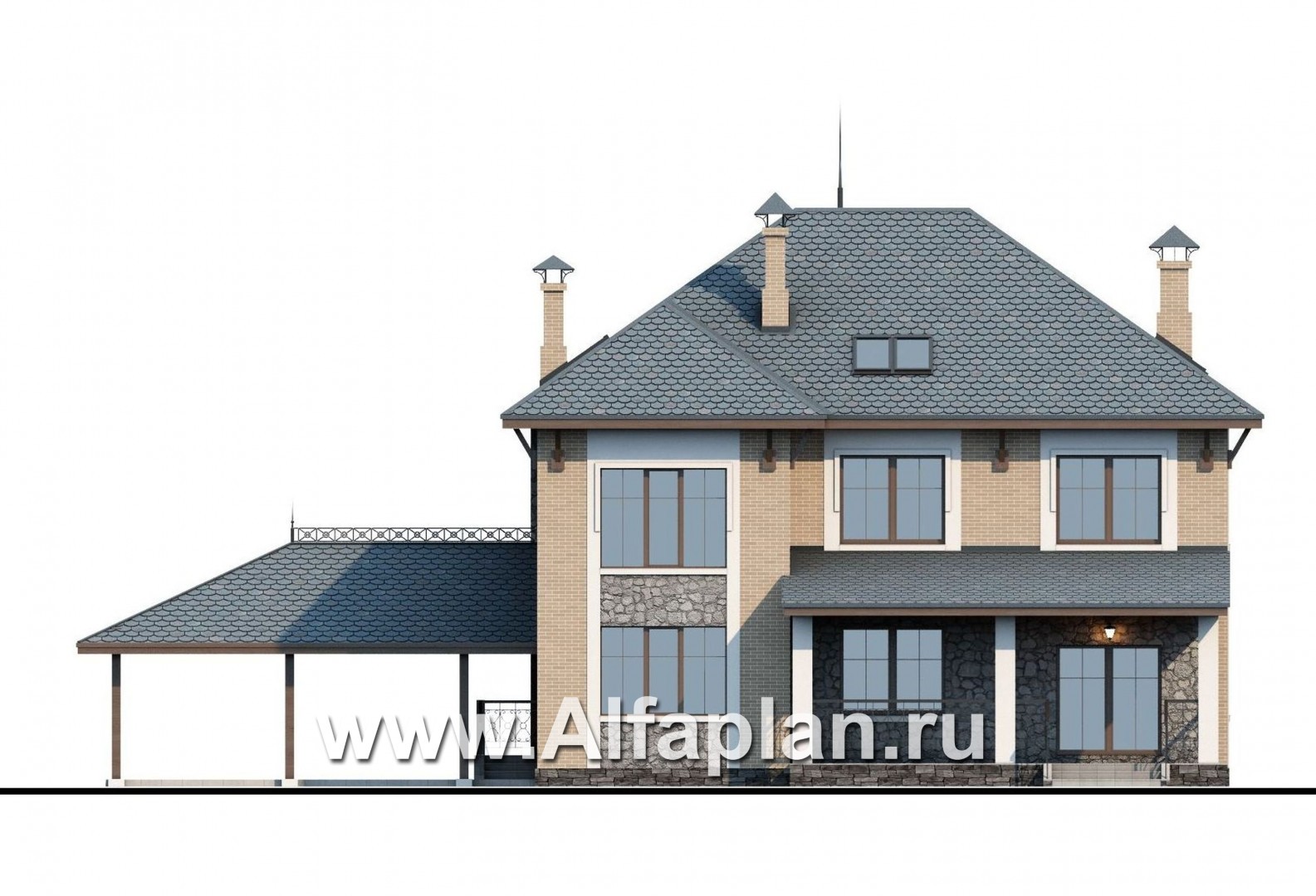 197E «Айвенго» - проект двухэтажного дома, с биллиардной в мансарде, с террасой и навесом на 2 авто, в стиле замка