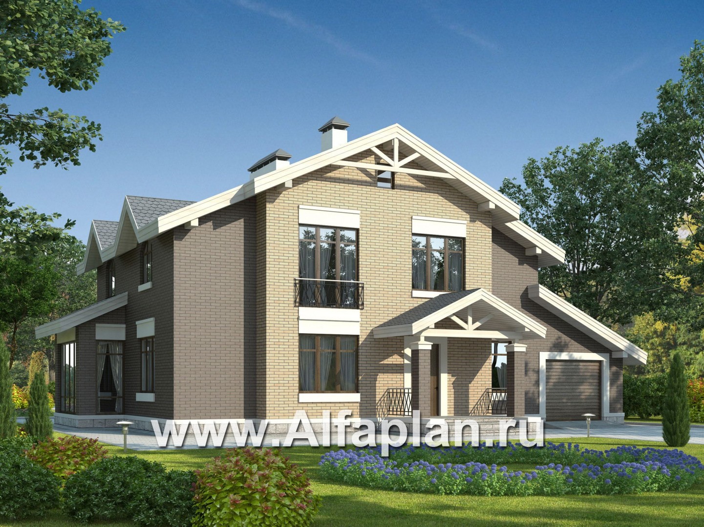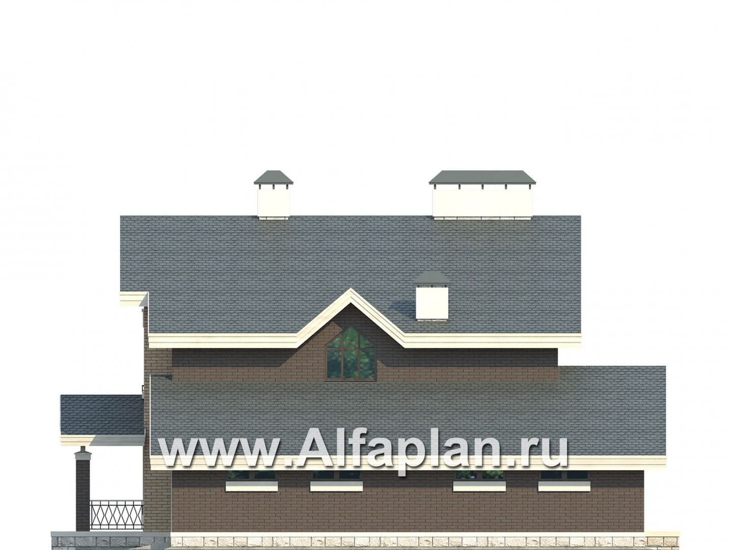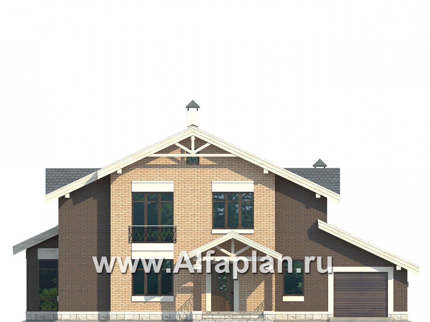 Проект дома с мансардой, план с эркером и с террасой, с гаражом и с сауной в цокольном этаже