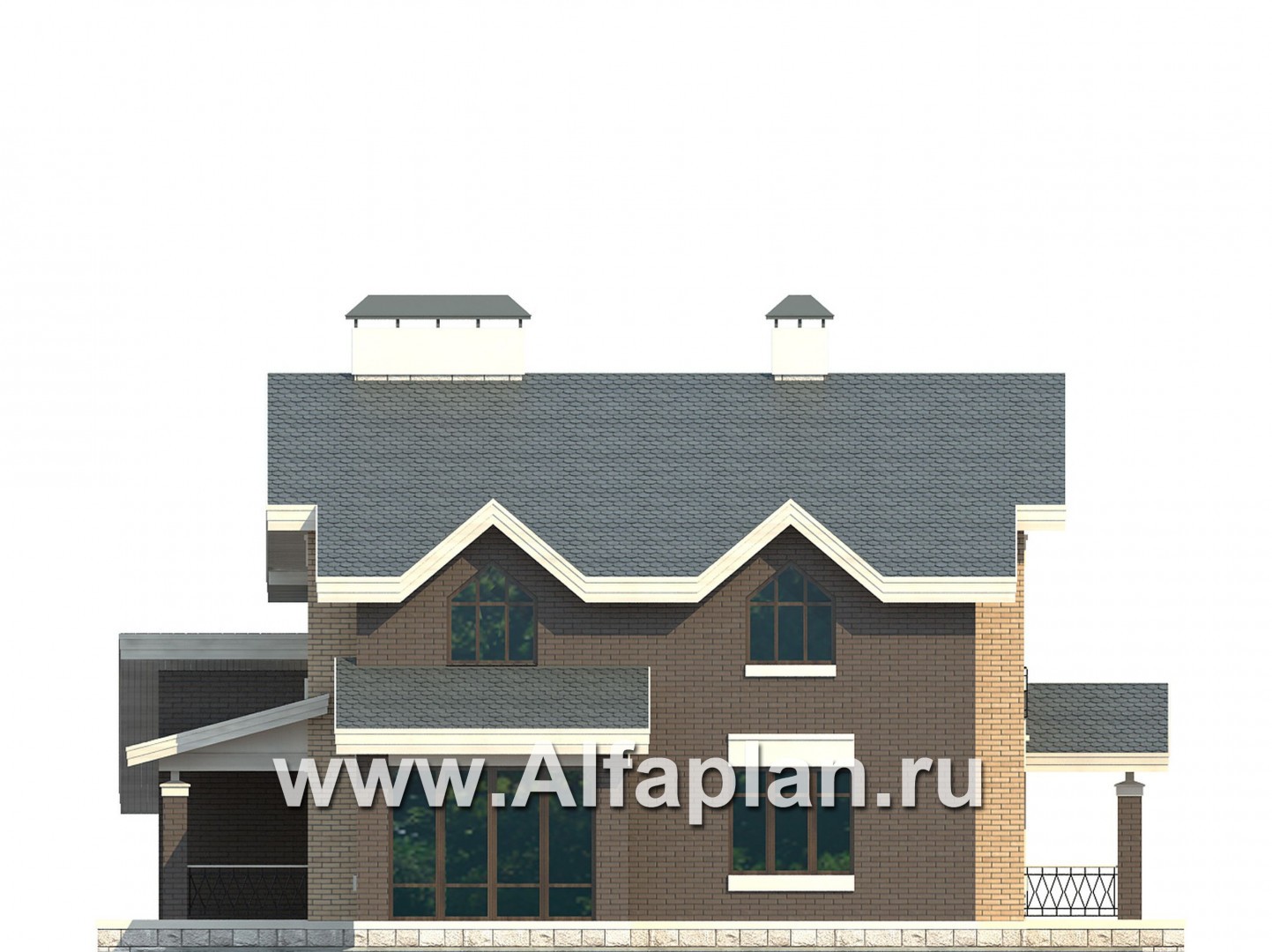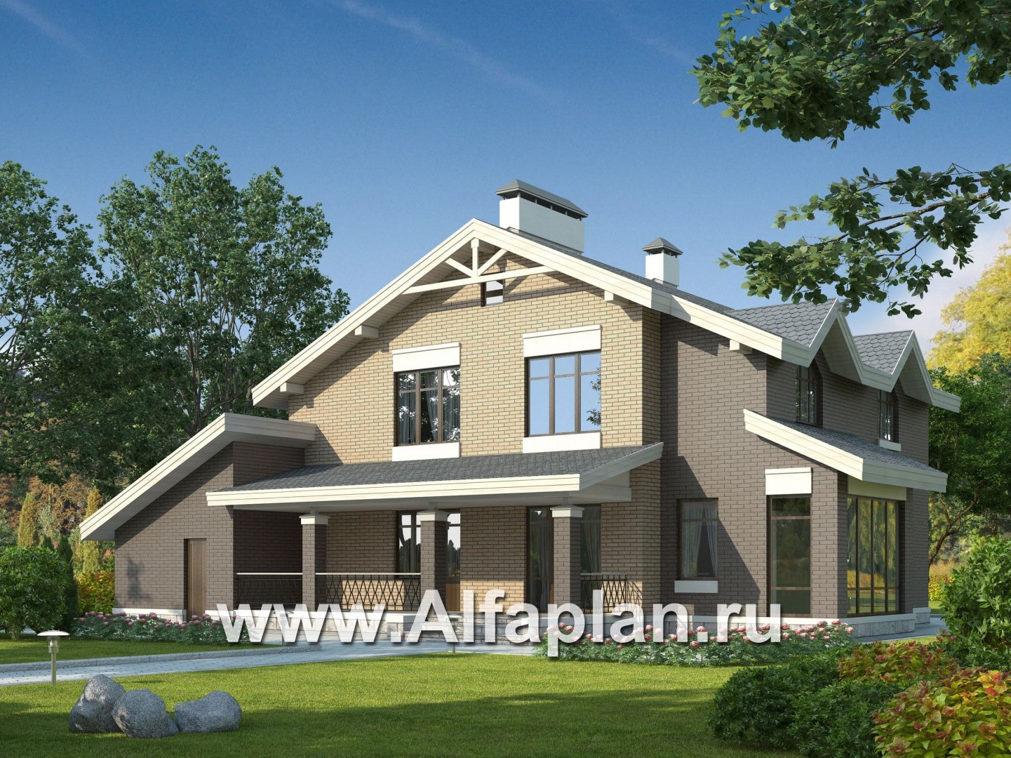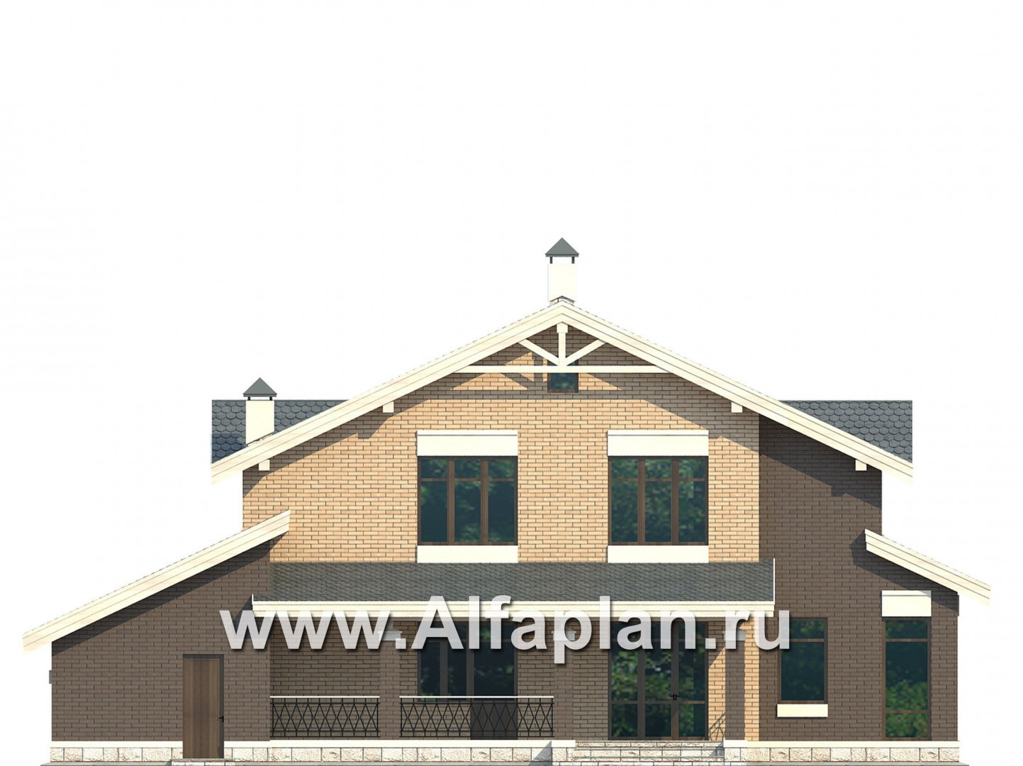 Проект дома с мансардой, план с эркером и с террасой, с гаражом и с сауной в цокольном этаже