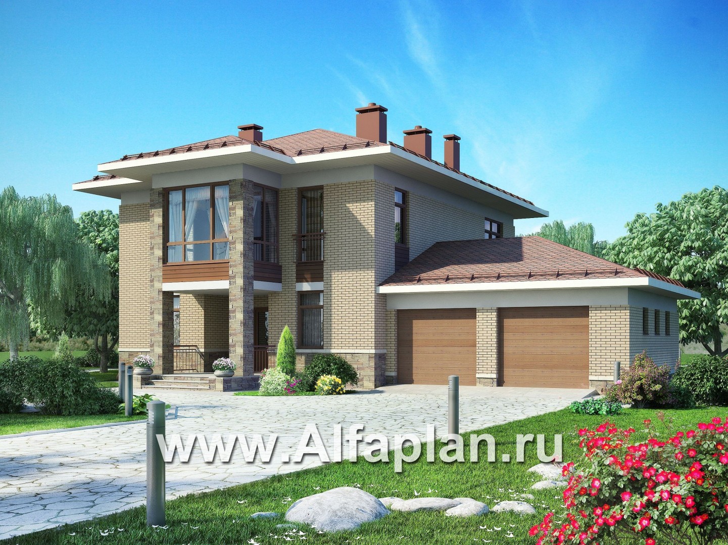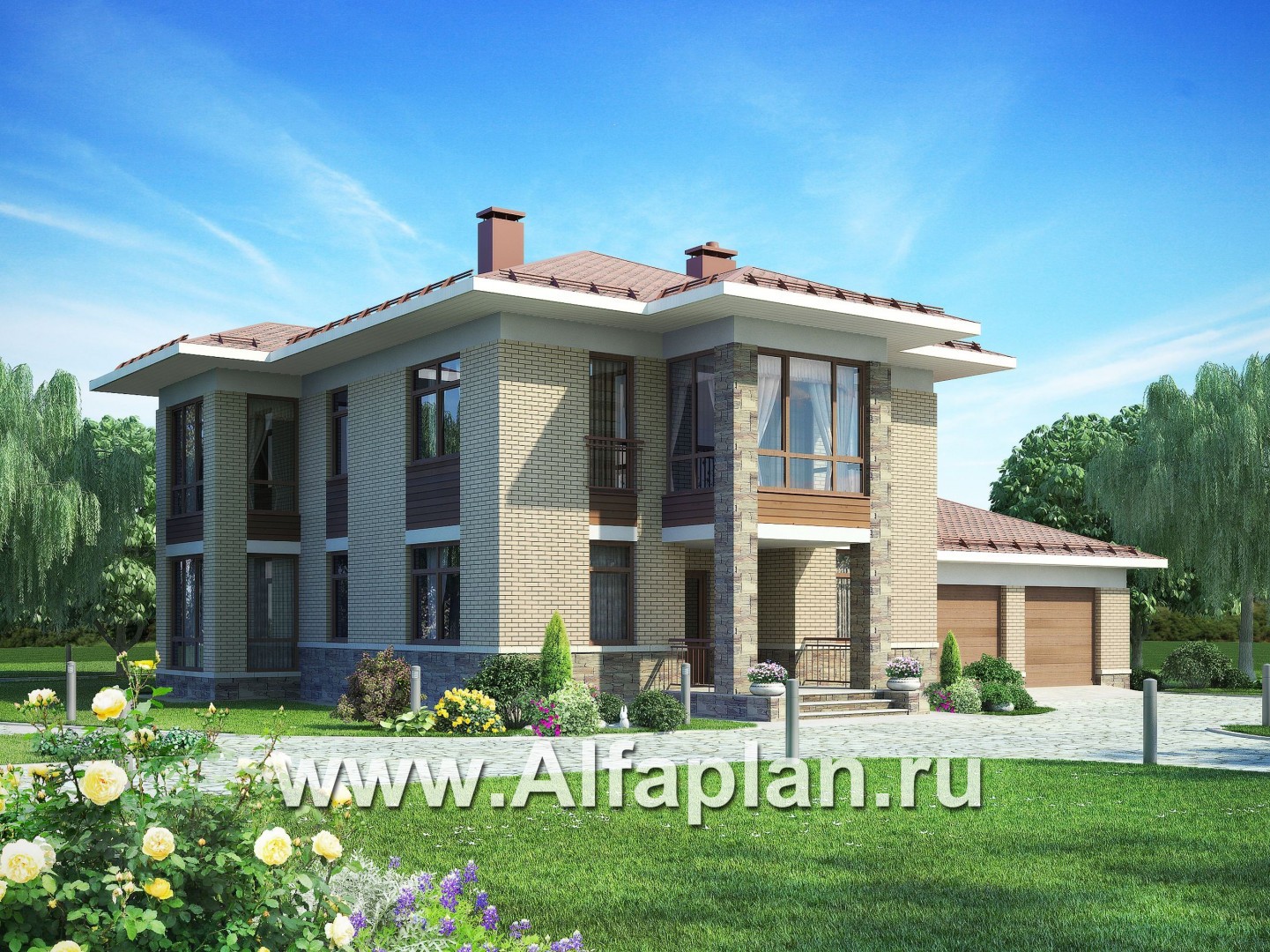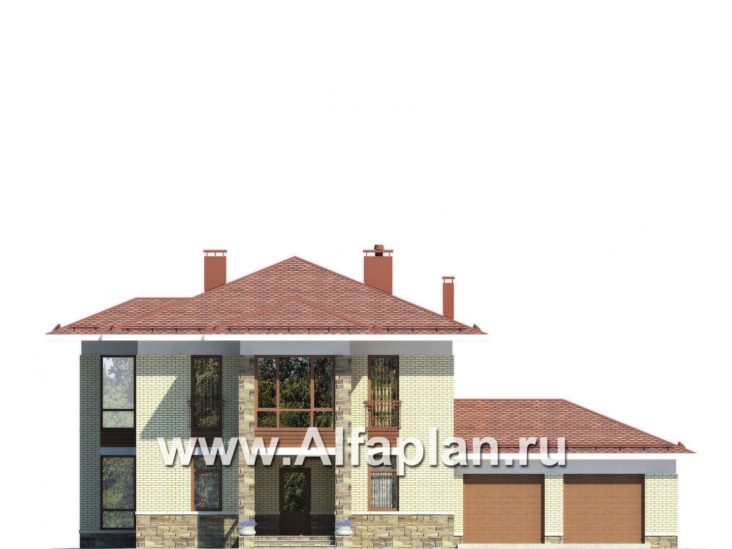 Проект двухэтажного дома из газобетона, планировка с гостевой на 1 эт и с гаражом на 2 авто, в современном стиле