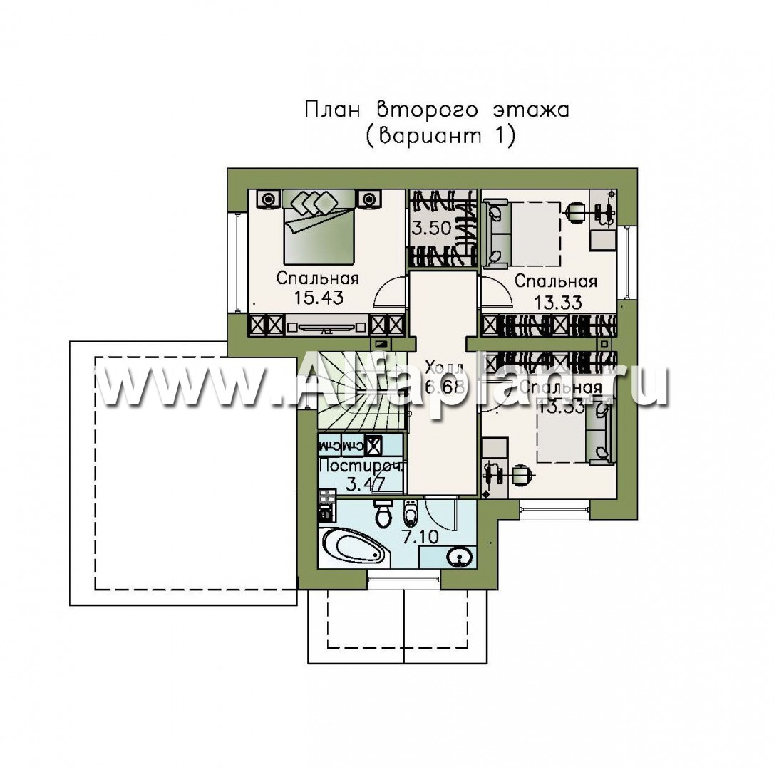 Удобное расположение комнат. На втором этаже расположена родительская с собственной гардеробной и две одинаковые комнаты для детей. Приватная зона лишена недостатков и идеально походит для небольшой семьи.