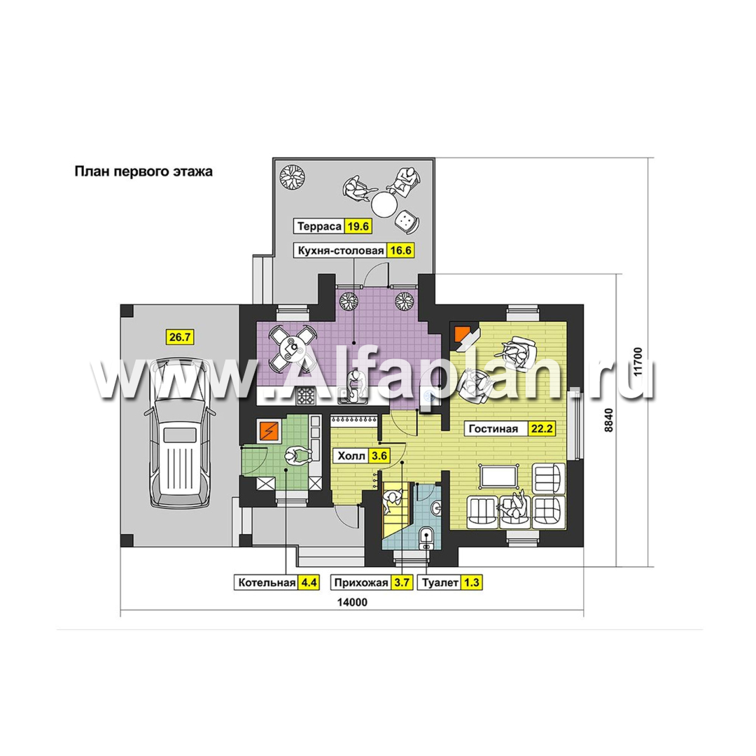 Пространство первого этажа, согласно проекту коттеджа, преимущественно отдано под гостевую зону. Это гостиная со сквозным освещением, занимающая все правое крыло, а также кухня-столовая, расположенная со стороны дворового фасада. Ее пространство расширено за счет террасы, снабженной собственным выходом во двор. В теплое время года она вполне может служить местом для семейных трапез. И гостиная, и кухня-столовая выходят в небольшой холл с лестницей, расположенной в остекленном эркере на главном фасаде.