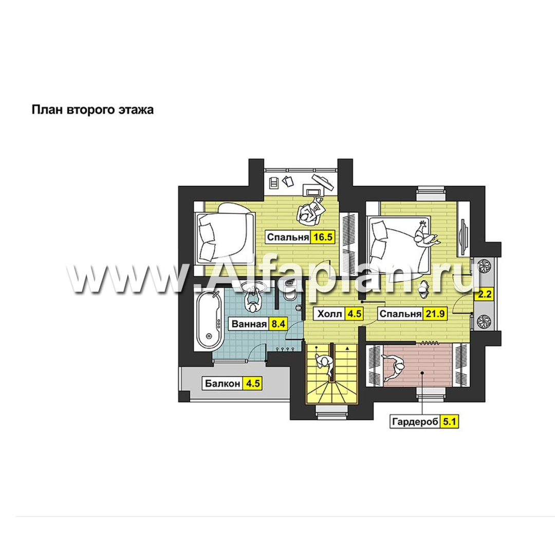 Второй, мансардный, этаж отдан под приватную зону: это две смежные спальни. Каждая снабжена огромным окном, обеспечивающим отличное естественное освещение. У помещения, занимающего правое крыло, предусмотрена отдельная гардеробная. Спальни, согласно проекту блочного дома, сгруппированы вокруг небольшого квадратного холла, откуда можно попасть в ванную комнату общего пользования, оборудованную выходом на балкон.